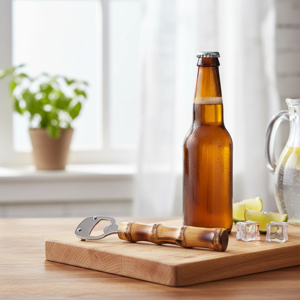 A abertura de uma boa bebida merece um gesto à altura. Este abridor de garrafas com estrutura metálica e cabo de estética natural estilo bambu combina praticidade e charme rústico, oferecendo uma pegada firme e confortável no dia a dia. Resistente e bonito, ele valoriza seu bar, cozinha ou área gourmet e transforma qualquer brinde em um momento mais especial.