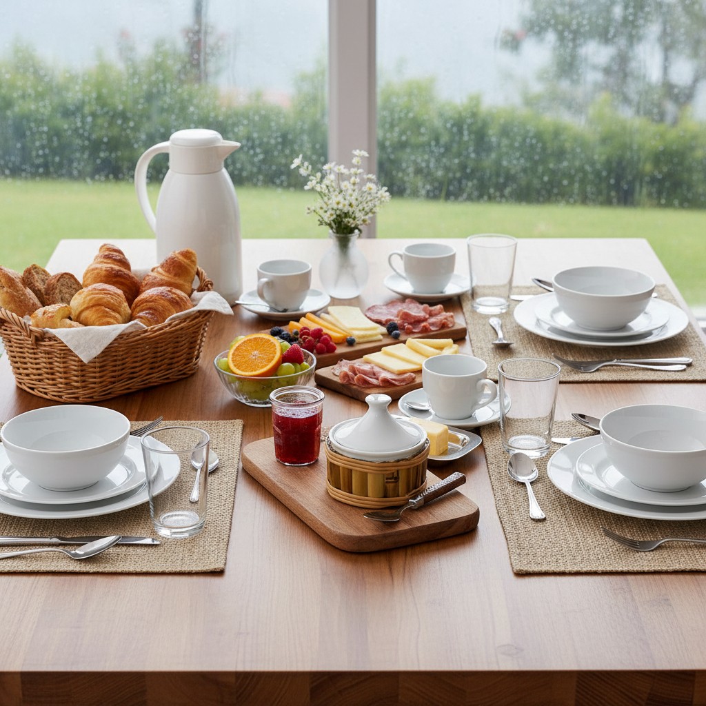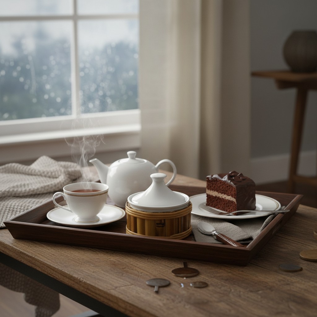– Mesa de Café e Chá: O par perfeito para sua garrafa térmica de bambu e xícaras de porcelana.