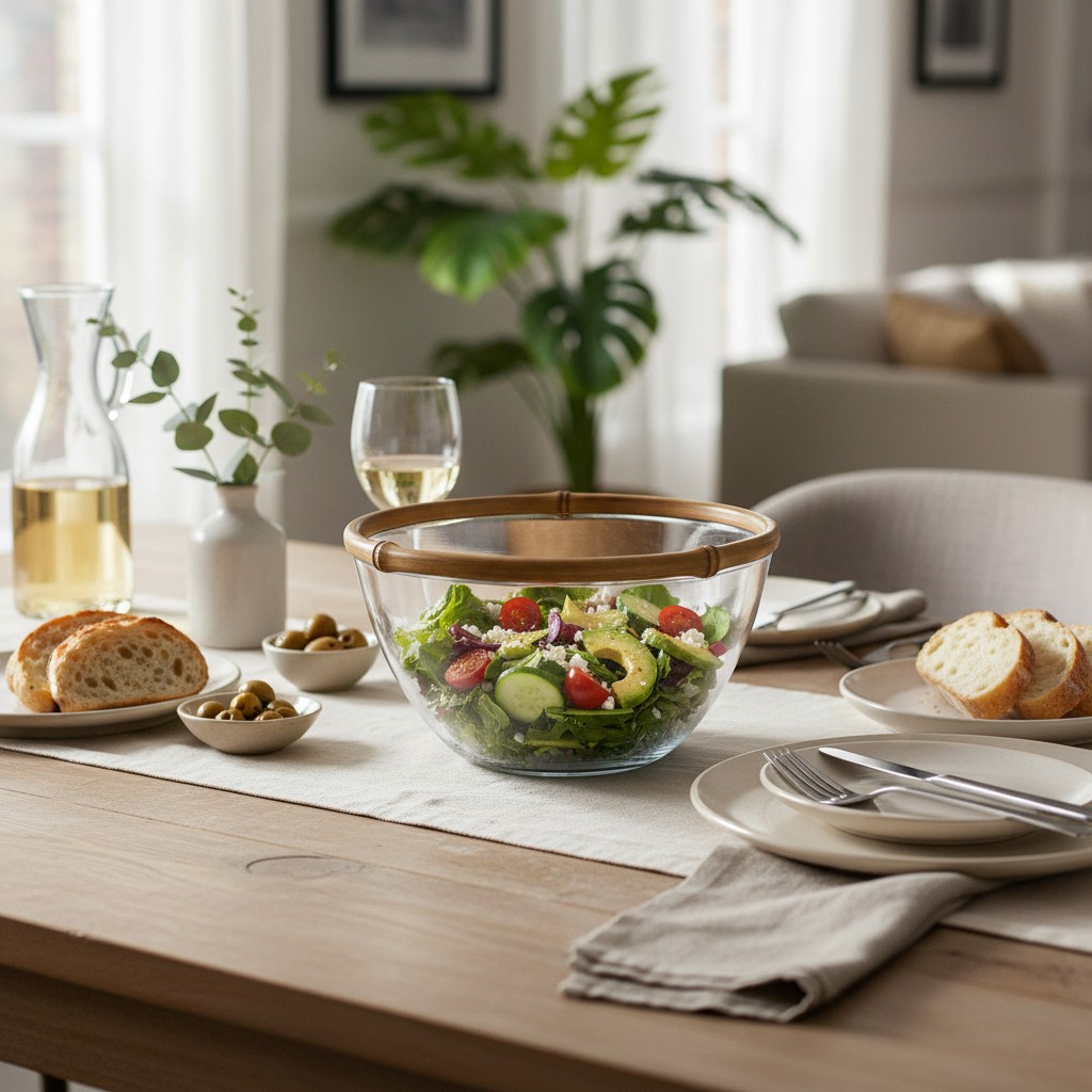 A amplitude do vidro cristalino encontra a força do bambu natural em uma peça de presença marcante e design fluido. Este Bowl M, com sua generosa capacidade de 2440 ml, é a tradução da hospitalidade com sofisticação. Ideal para servir saladas, massas ou acompanhamentos em reuniões de família e amigos, ele une a transparência impecável do vidro à alma da natureza, garantindo que a beleza das suas receitas seja o centro das atenções com um toque rústico-chique inconfundível.