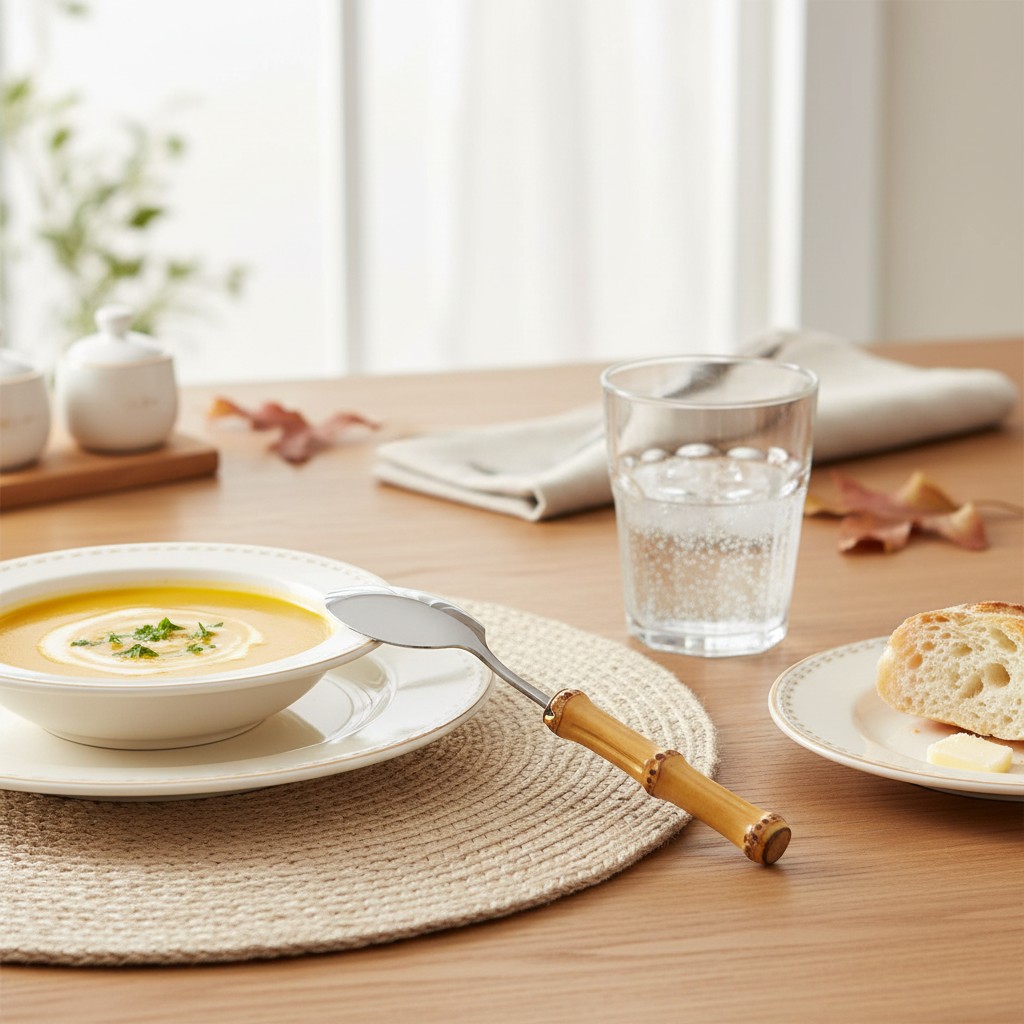 O essencial com presença: a Colher de Mesa em inox com cabo de bambu natural leva para a refeição o equilíbrio perfeito entre elegância, conforto e aquele toque rústico-chique que transforma o dia a dia.