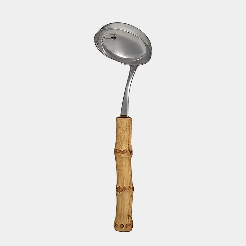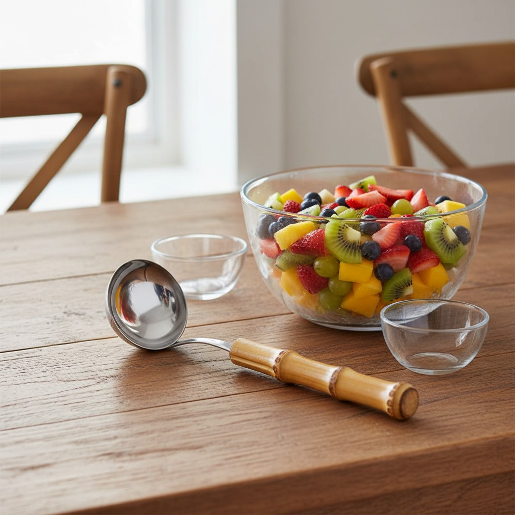 Sirva com charme e precisão: a Concha Média em inox com cabo de bambu natural traz praticidade para o dia a dia e um toque acolhedor para a mesa posta, na medida certa para caldos, feijão e molhos.