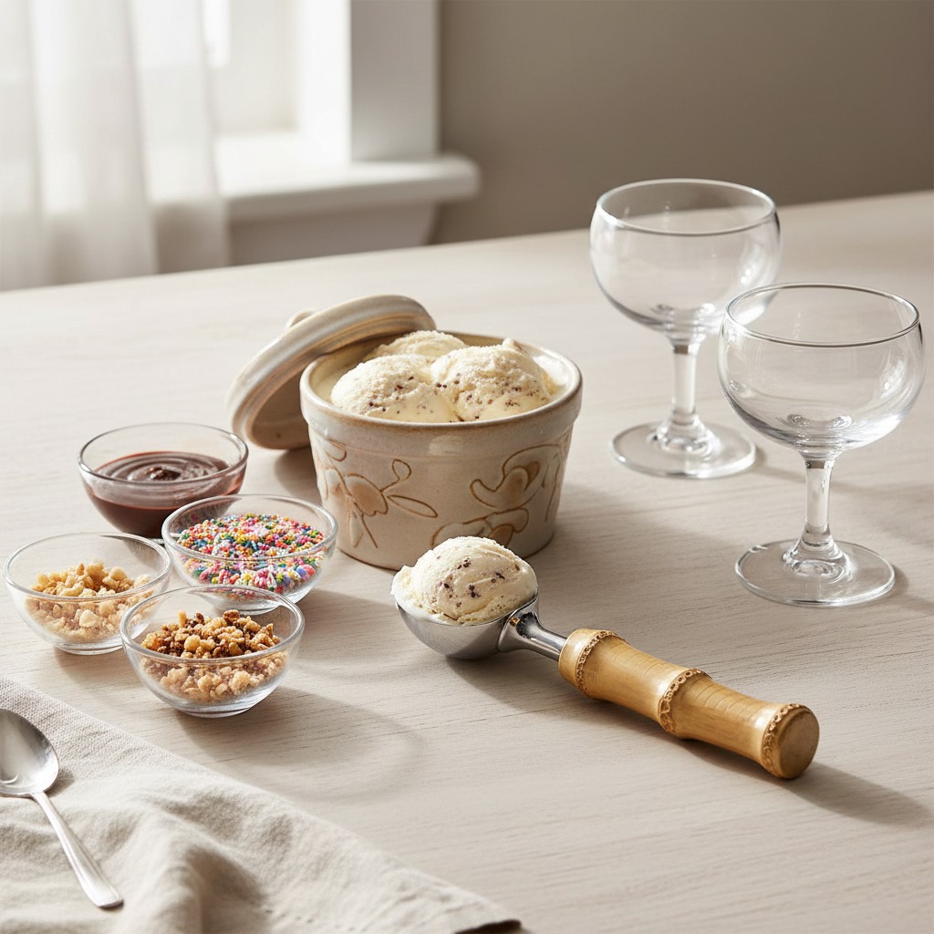 Sobremesa com estilo: a Concha de Sorvete em inox com cabo de bambu natural une a resistência necessária para servir bolas perfeitas ao charme orgânico que transforma qualquer momento doce em uma experiência especial.