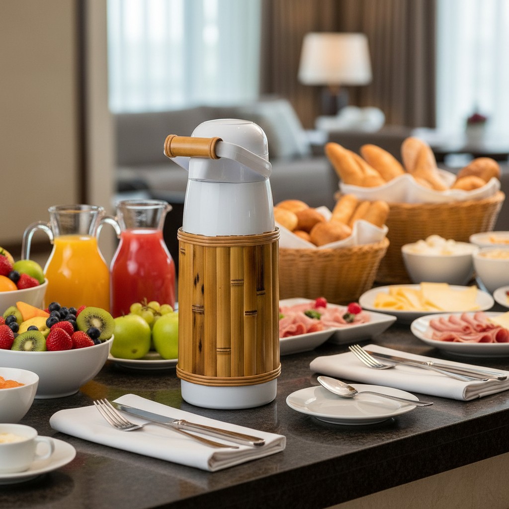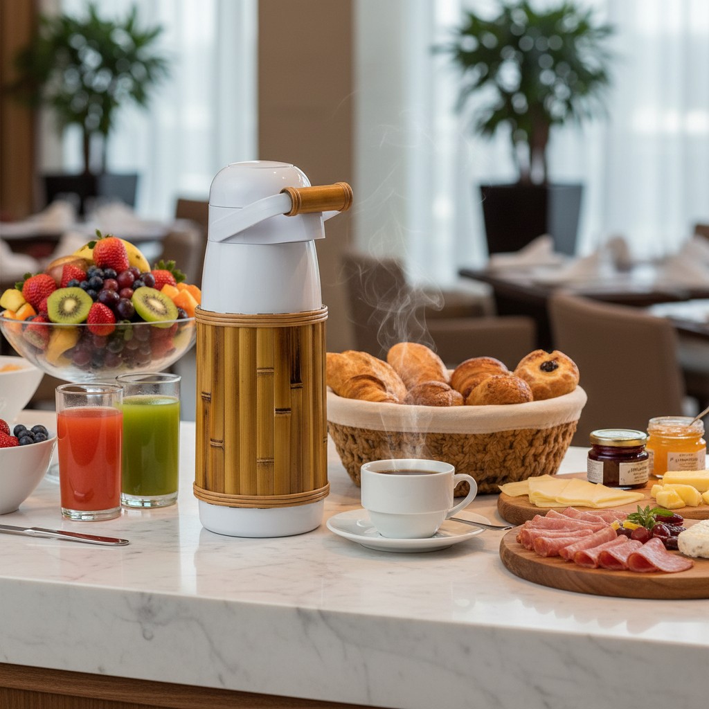 A união perfeita entre a pureza do branco e o calor do bambu natural. Com 1,8 litros de capacidade, esta garrafa é a escolha ideal para quem precisa servir grandes grupos com sofisticação. Seu design clean ilumina a mesa posta, mantendo o café ou chá na temperatura ideal por muito mais tempo. Um toque de hotelaria de luxo diretamente na sua casa.
