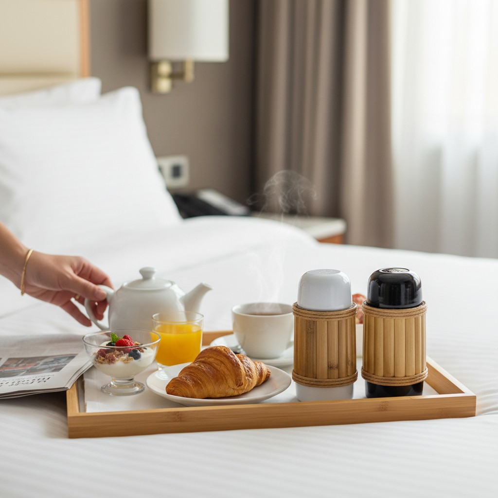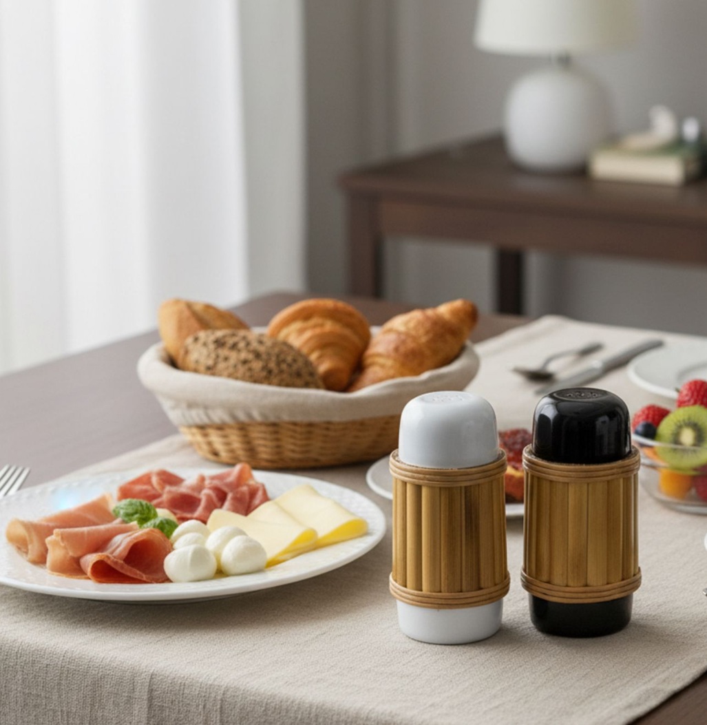Este kit traz duas garrafinhas térmicas de 250 ml, ideais para quem valoriza praticidade sem abrir mão do design sofisticado. A combinação do branco puro com o preto elegante, realçada pela capa artesanal em bambu, cria peças versáteis que se adaptam a qualquer ambiente.