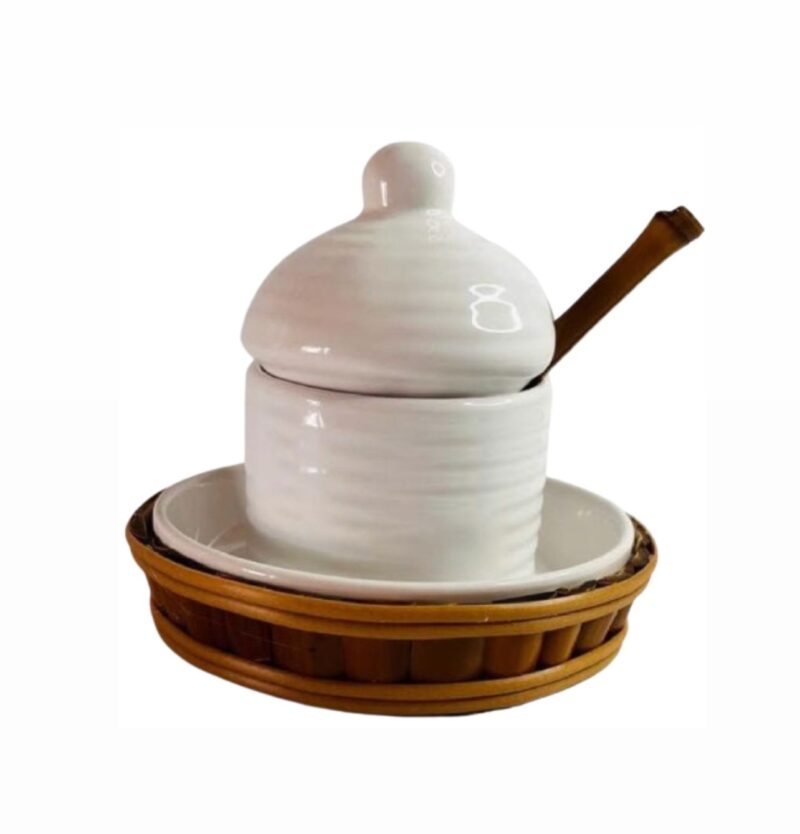 Design delicado e funcional para sua mesa posta. A meleira de cerâmica branca com detalhes em bambu une sofisticação e praticidade para armazenar e servir mel com estilo e proteção. Utilize com o porta queijo e a manteigueira da mesma linha para uma mesa ainda mais especial.