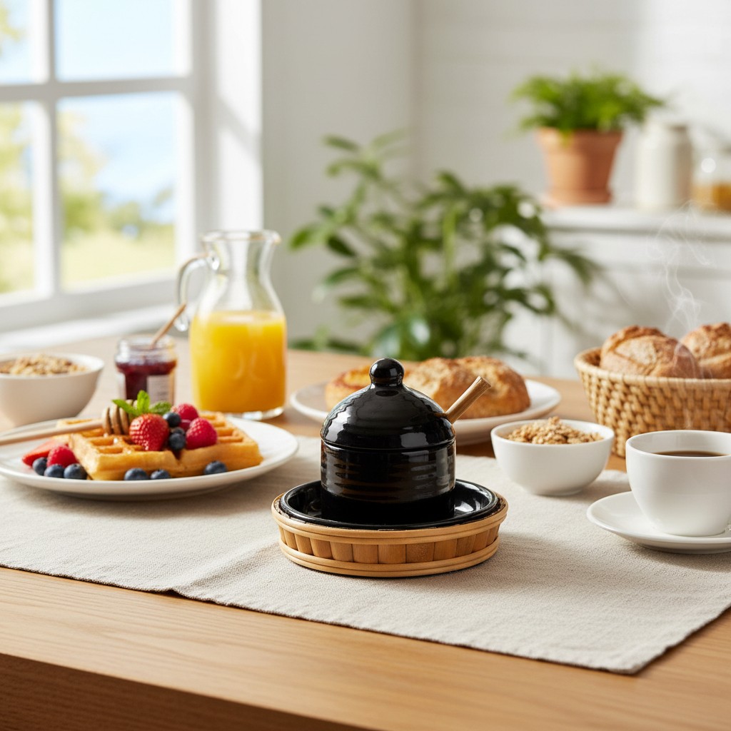 A Meleira Rico Bambu combina a resistência e o acabamento refinado da cerâmica preta com o charme natural do bambu. Sua tampa com puxador arredondado e o pequeno furo para colher facilitam o uso, enquanto a base em cerâmica com moldura em bambu traz aconchego e sofisticação para a mesa posta. Ideal para manter o mel protegido e pronto para servir, valorizando a apresentação em qualquer ocasião.