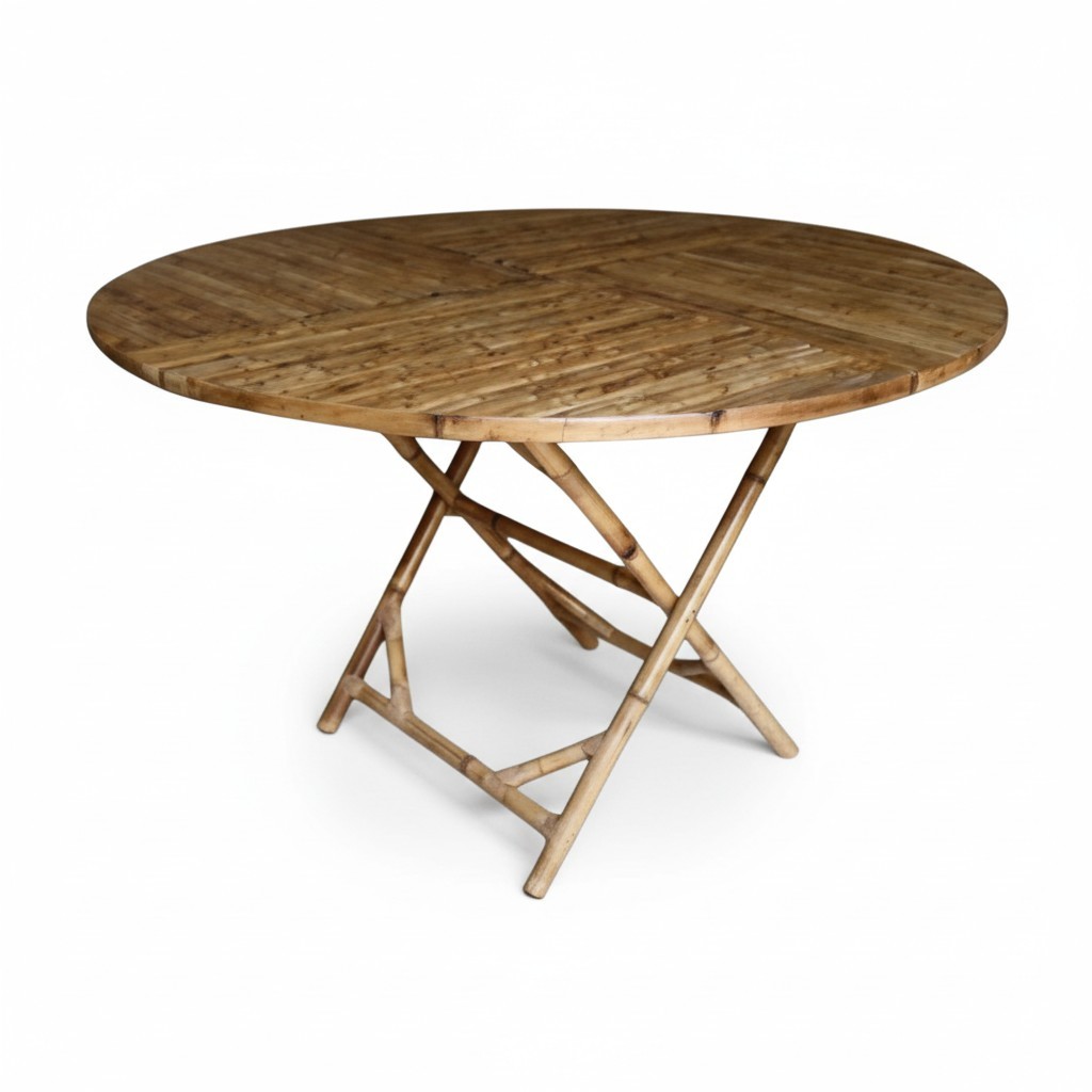 A imponência da natureza encontra o design funcional em uma peça que é puro protagonismo. Com 110 cm de diâmetro e 75 cm de altura, esta mesa de jantar circular em bambu natural é a escolha perfeita para reunir a família e amigos com conforto e sofisticação. Seu tampo generoso, com trama artesanal exclusiva, repousa sobre um cavalete robusto e dobrável, unindo a força da matéria-prima sustentável à praticidade de um móvel inteligente. Leve a alma do bambu para o centro das suas celebrações e transforme cada refeição em um momento inesquecível.