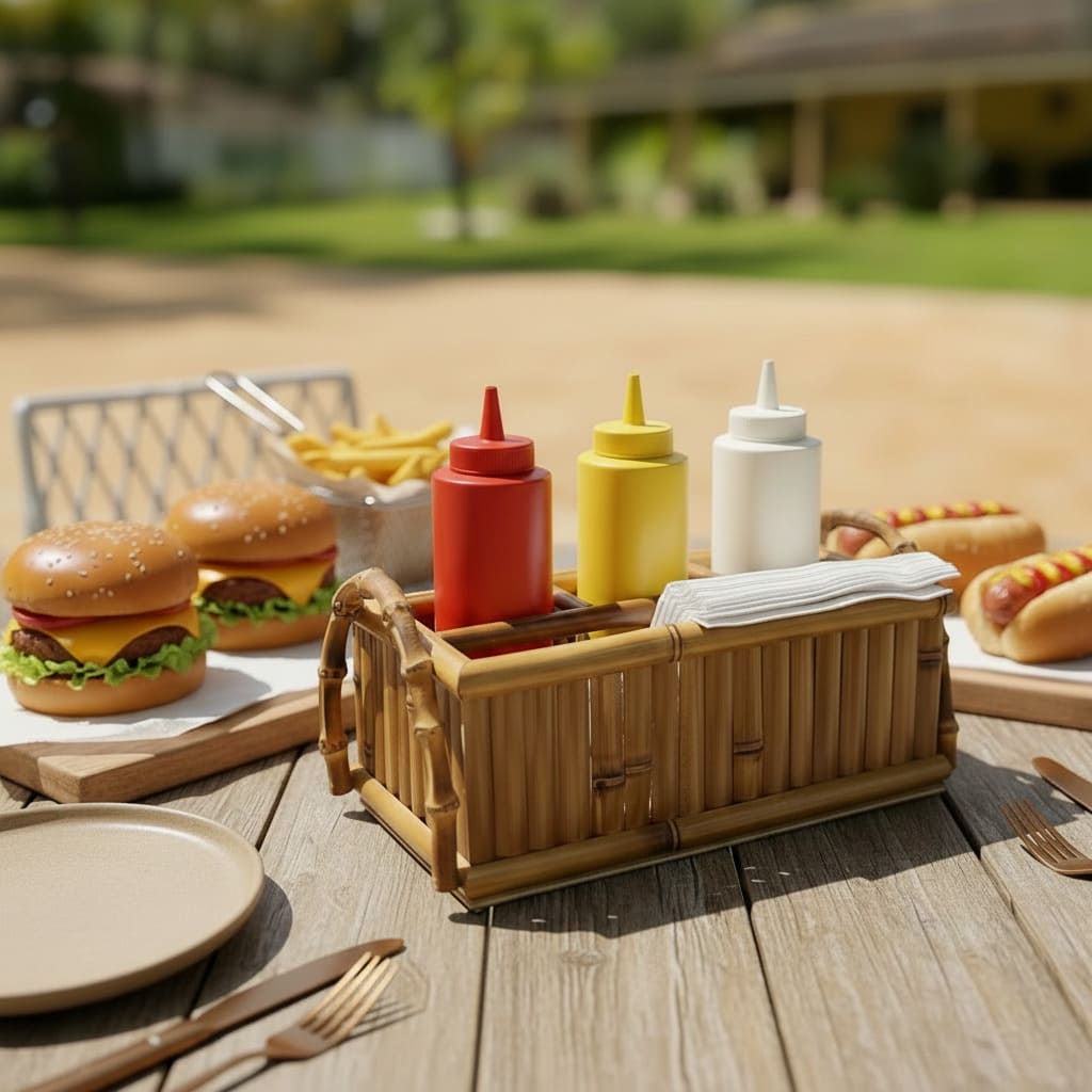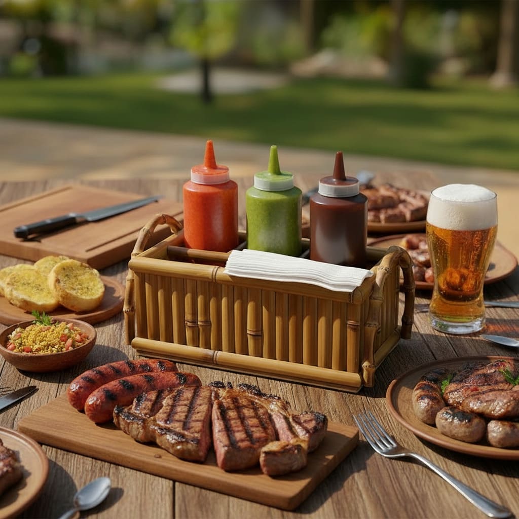 – No Churrasco ou Mesa de Lanches: Acomode frascos de ketchup, mostarda, maionese ou molhos de pimenta, mantendo os guardanapos sempre à mão.