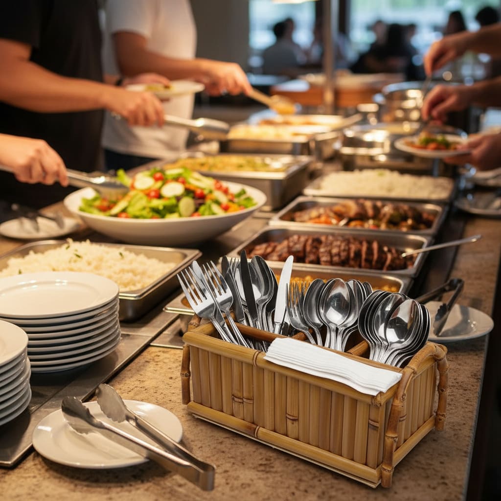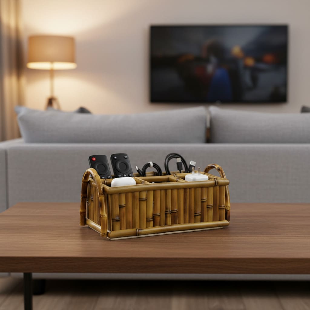 Uma peça definitiva para organizar sua mesa com estilo e praticidade. Este organizador multifuncional em bambu artesanal adapta-se a qualquer ocasião: use para talheres e guardanapos em buffets, para molhos e condimentos em lanches e churrascos, e também como organizador para o dia a dia — controles remotos, fones de ouvido e carregadores na sala, ou ainda lápis de cor, canetinhas, tesoura, bloco de anotações e materiais de artesanato no cantinho de estudos. Com alças laterais anatômicas e design robusto, é o item que une a funcionalidade diária à sofisticação da mesa posta.