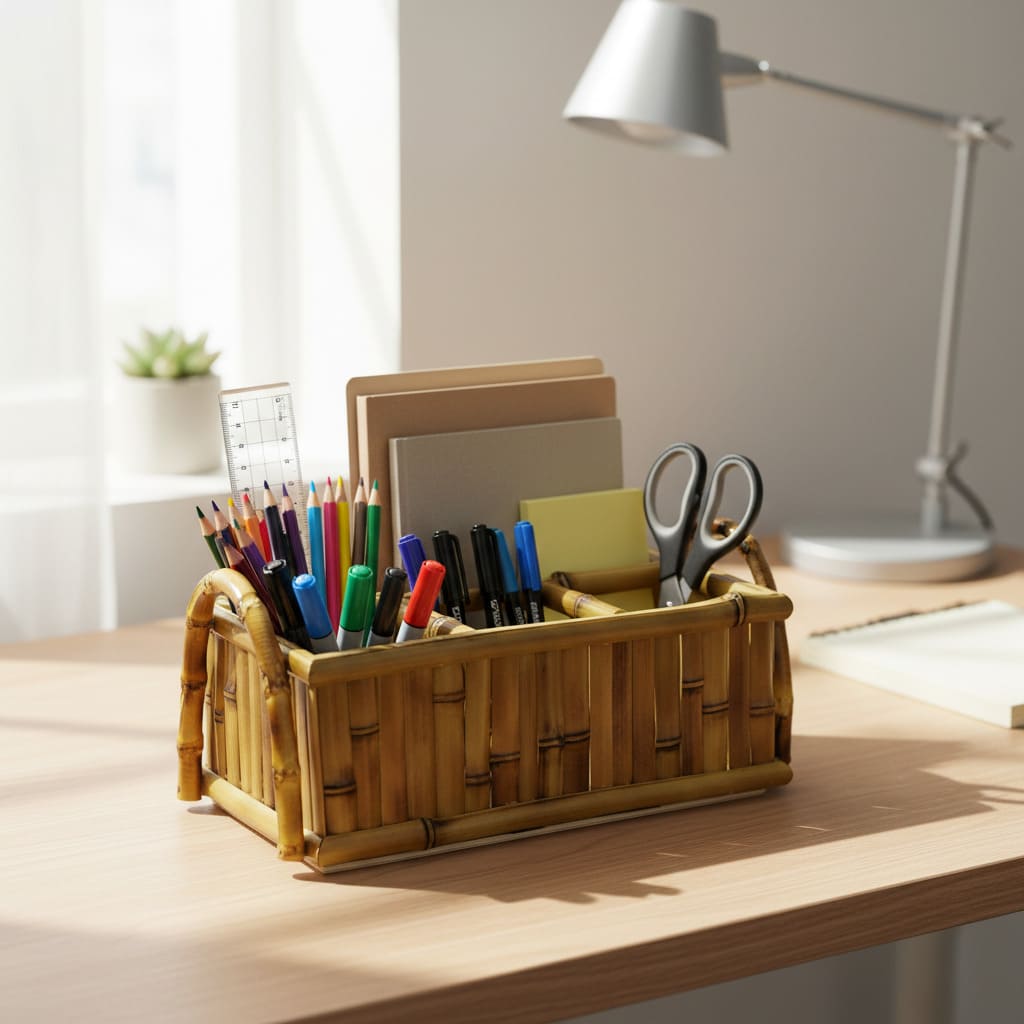 – No Home Office: Mantenha blocos de notas, canetas e acessórios de escritório em um só lugar, com o toque acolhedor do bambu.