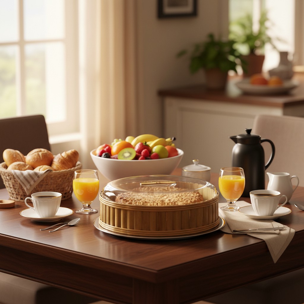 – Cúpula de Acrílico com Puxador de Bambu: A tampa transparente de alta protege contra agentes externos e mantém a textura ideal do bolo, enquanto o puxador em bambu garante um toque seguro e charmoso.