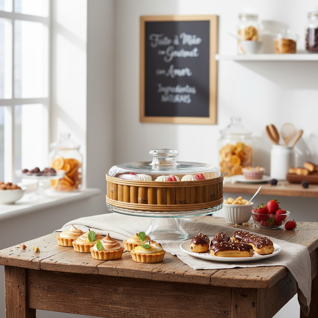 A imponência do vidro cristalino com pé encontra a moldura orgânica do bambu para criar o palco definitivo das suas melhores receitas. Esta boleira, com design elevado e alta transparência, destaca-se pelo exclusivo revestimento artesanal em ripas de bambu natural ao redor da tampa. Unindo a proteção necessária à estética rústico-chique, ela transforma bolos, tortas e pães no centro das atenções de qualquer mesa posta. Uma peça que exala sofisticação, altura e acolhimento, ideal para quem acredita que a arte de servir merece um lugar de destaque.