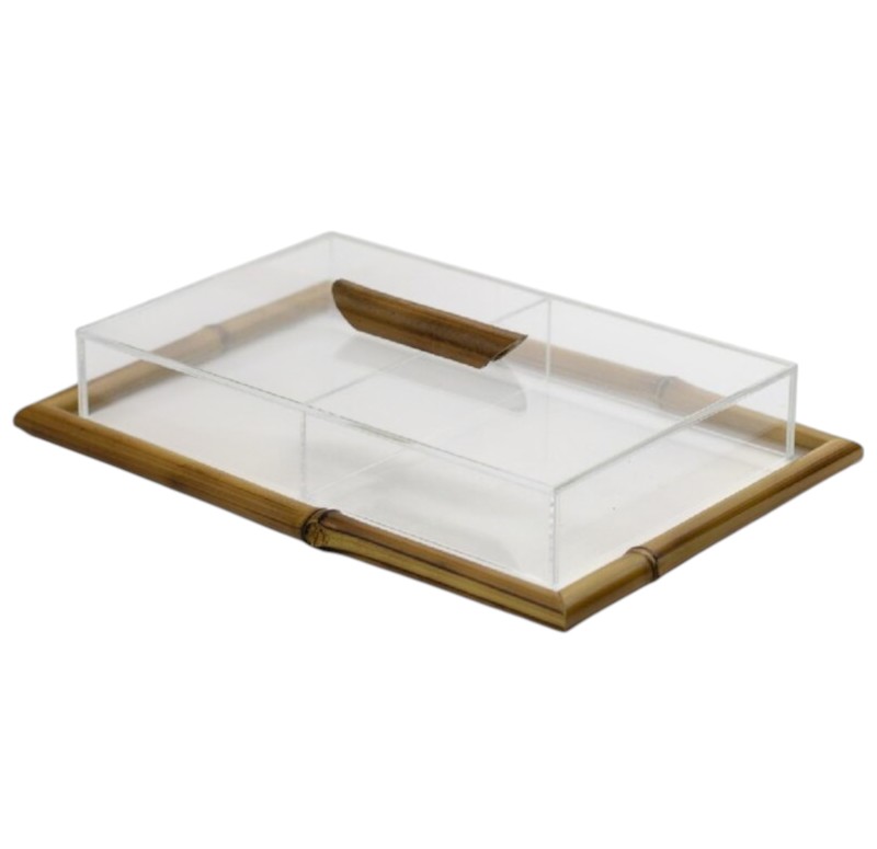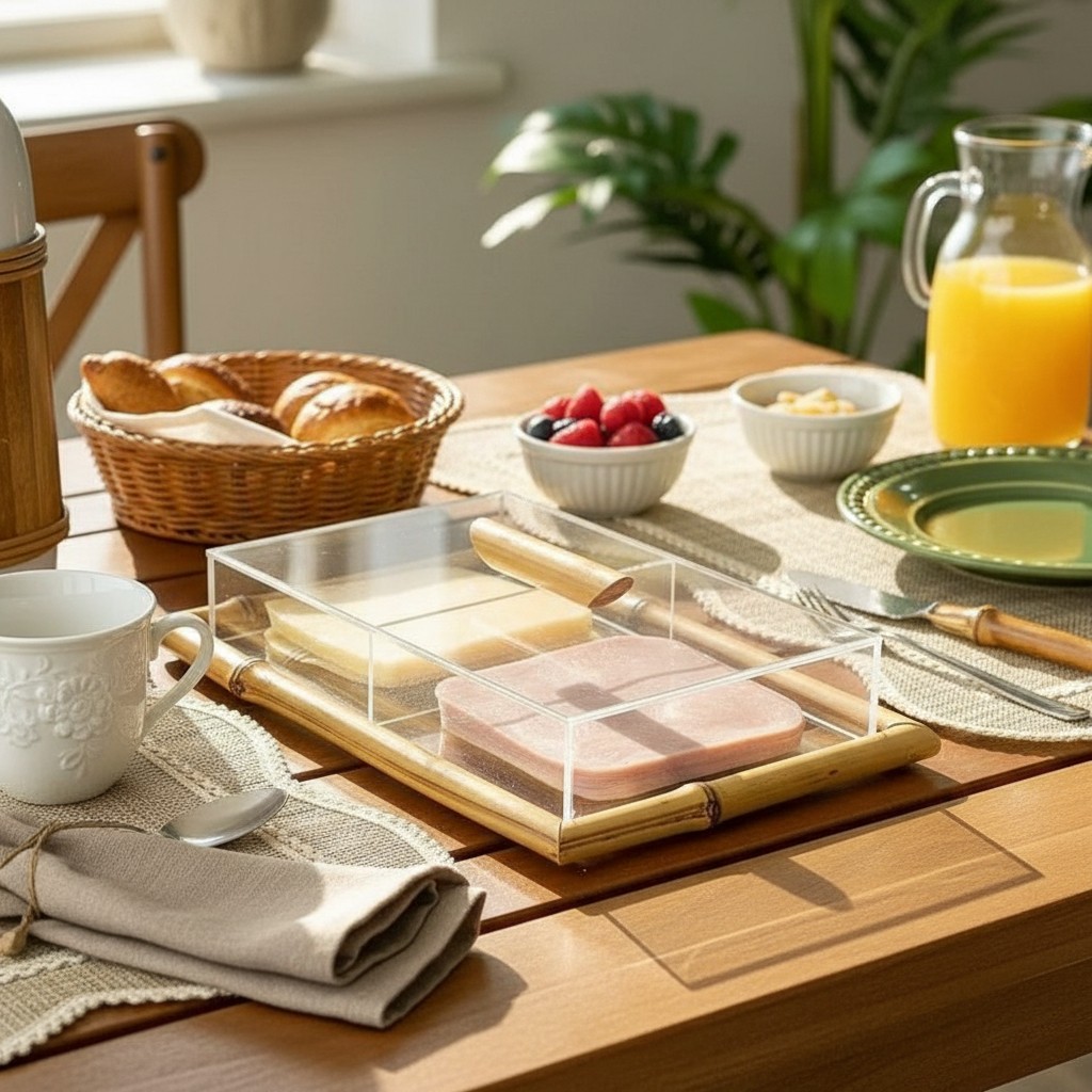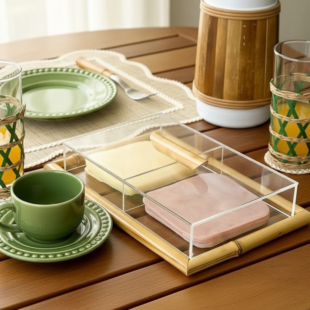 O Porta-Frios Rico Bambu é a solução ideal para manter seus queijos, embutidos e petiscos frescos e protegidos, sem abrir mão da beleza na apresentação. A tampa de acrílico transparente permite visualizar o conteúdo com facilidade, enquanto a base em vidro com moldura de bambu natural traz um toque artesanal e acolhedor à sua mesa.