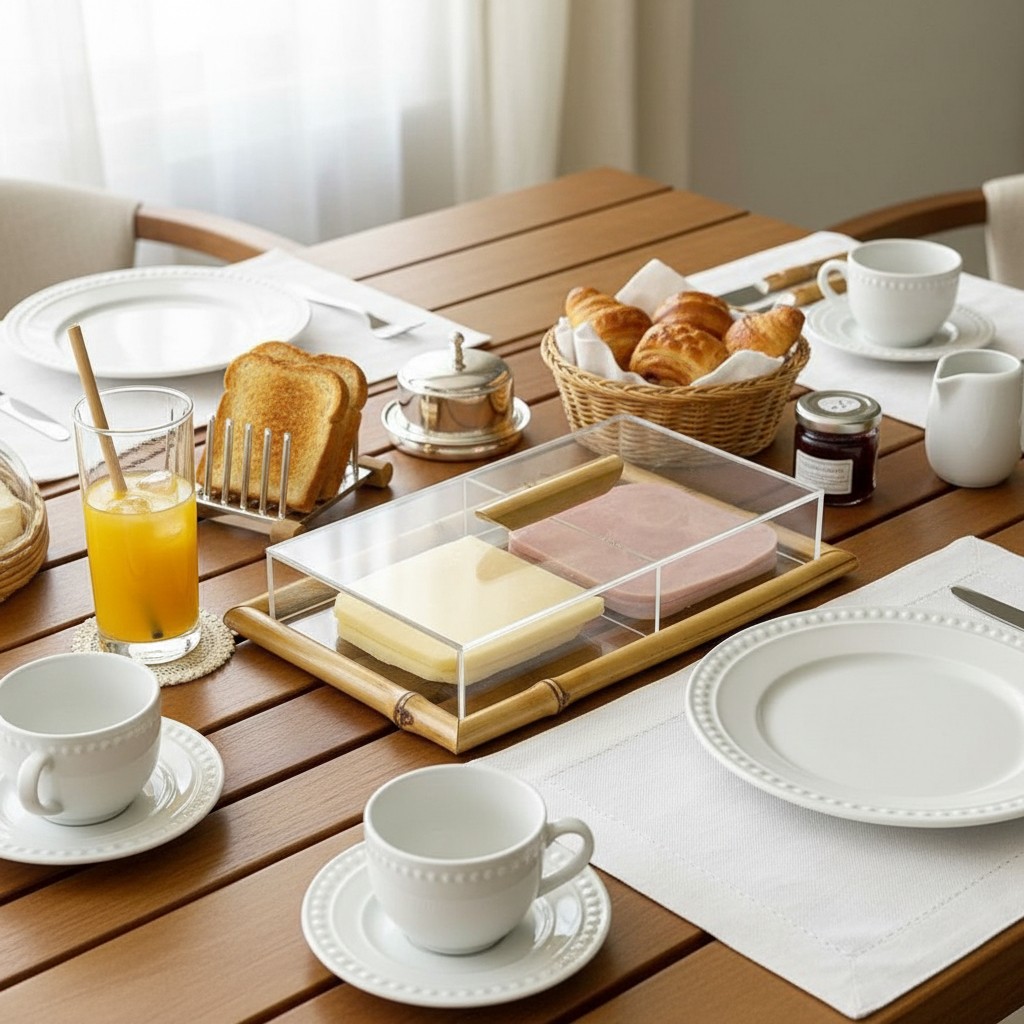 – Mesa de Café da Manhã: Organize queijos, frios e pães mantendo-os protegidos e com fácil visualização.