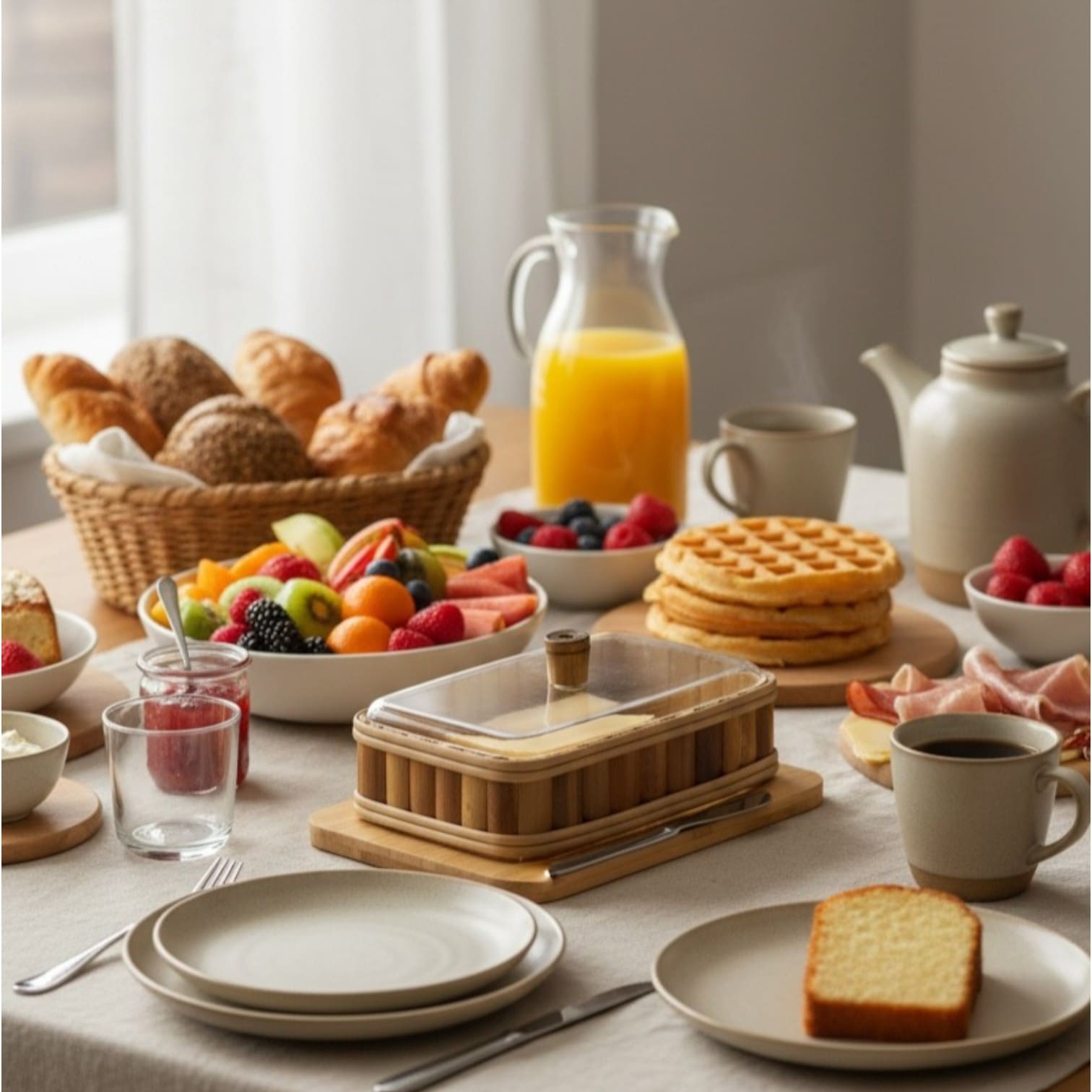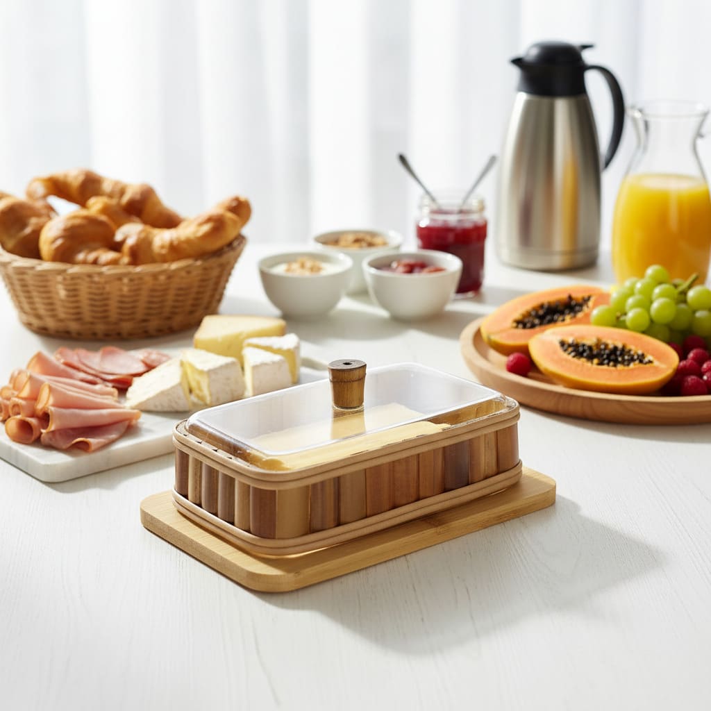 Um clássico da mesa posta com toque natural. O porta manteiga em bambu com tampa de acrílico protege, organiza e valoriza o café da manhã, deixando a manteiga sempre pronta para servir com elegância.