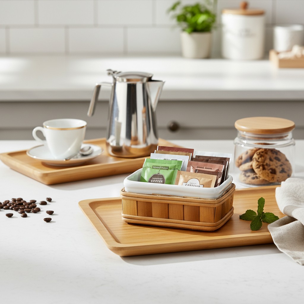 – Cantinho do Café Gourmet: Organize seus sachês em bandejas de bambu, criando uma estação de café digna de uma boutique de luxo.