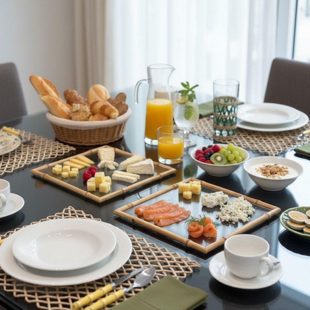 – Mesa de Queijos e Charcutaria: Utilize o amplo espaço quadrado para montar uma tábua de frios artísticas, intercalando queijos, uvas, nozes e ramos de alecrim.