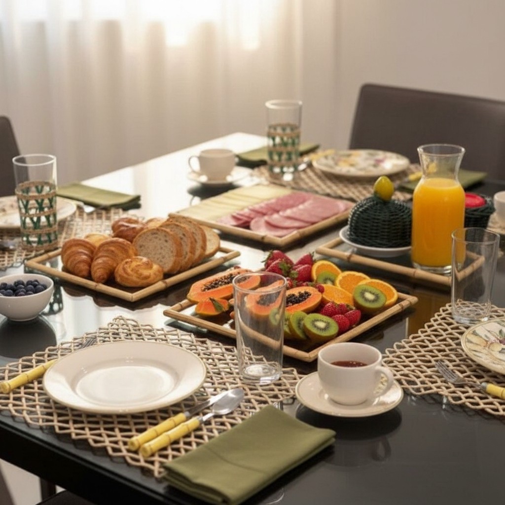 – Simetria e Organização: O design quadrado ajuda a alinhar os itens na mesa, facilitando a organização de mesas fartas e garantindo que tudo esteja ao alcance dos convidados.