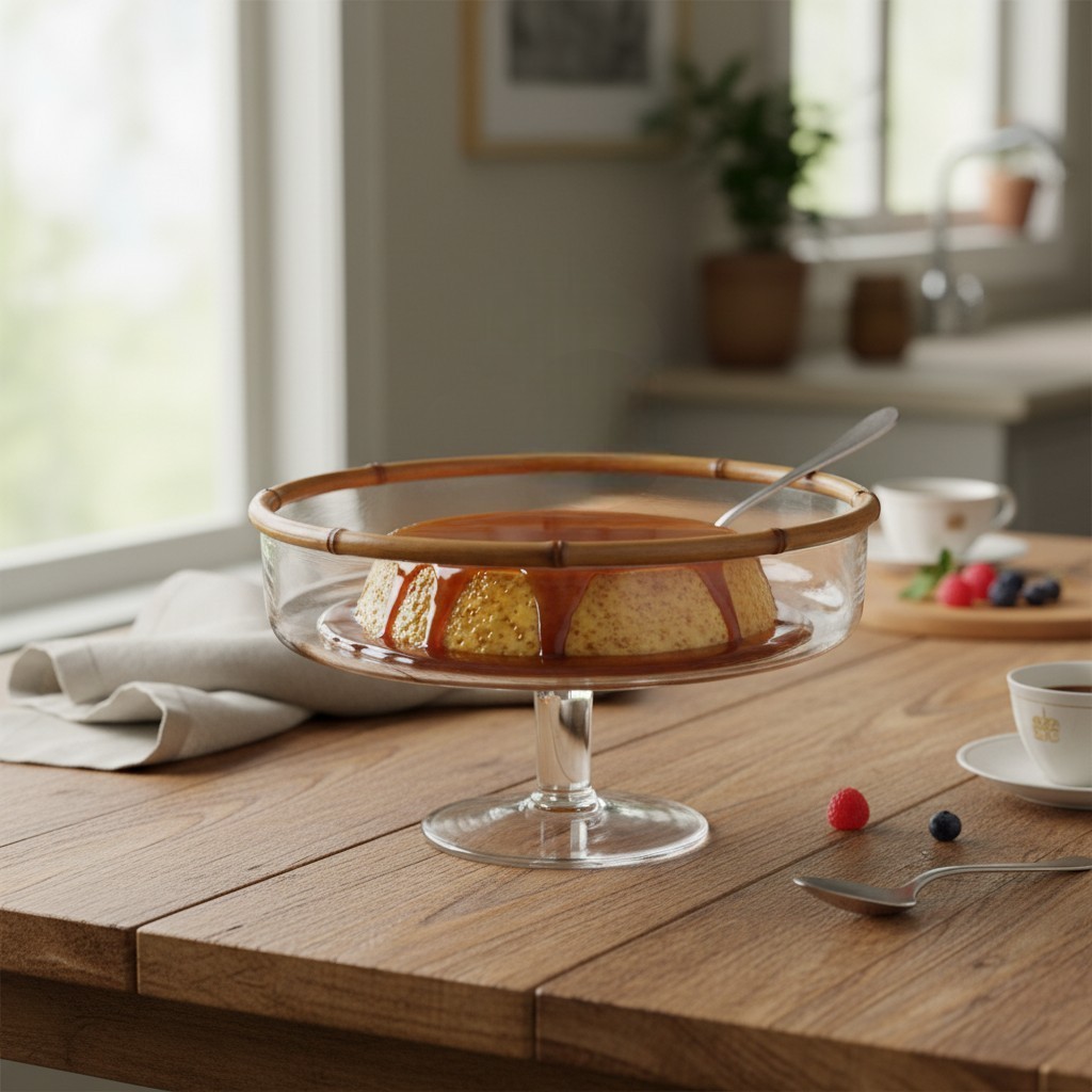 A imponência do vidro cristalino em sua escala máxima de sofisticação. Este Prato Fundo com Pé M, com sua extraordinária capacidade de 5.000 ml e dimensões de 32 cm de diâmetro por 19 cm de altura, é a peça definitiva para quem busca criar um centro de mesa monumental. Unindo a transparência absoluta do vidro ao exclusivo acabamento artesanal em bambu natural na borda, ele funciona como um pedestal de luxo para servir com abundância e elegância. Uma peça de presença soberana que traz altura e o inconfundível charme rústico-chique da nossa marca para as suas melhores celebrações.