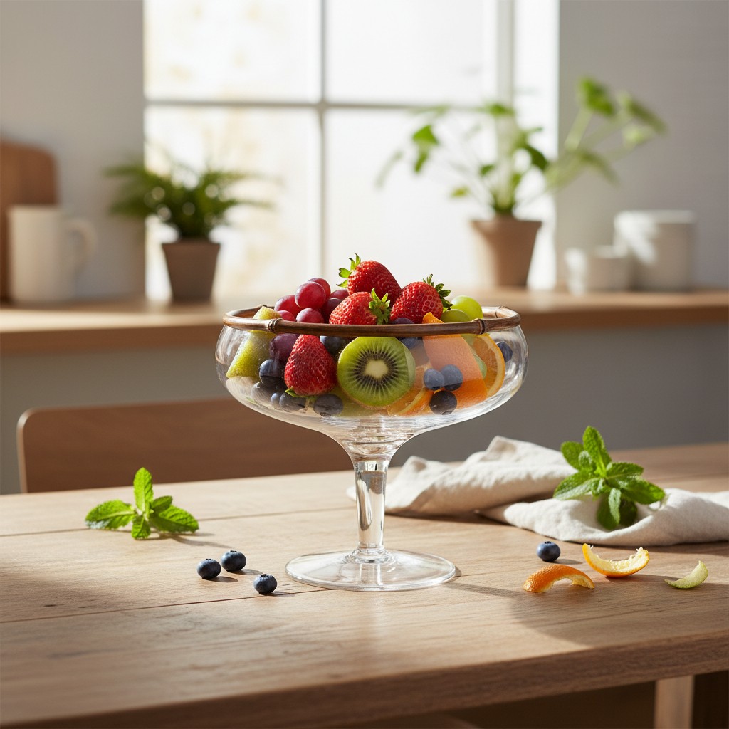 – Fruteira de Centro de Mesa: Utilize como peça decorativa e funcional, exibindo frutas da estação com as cores vibrantes valorizadas pela transparência do vidro.