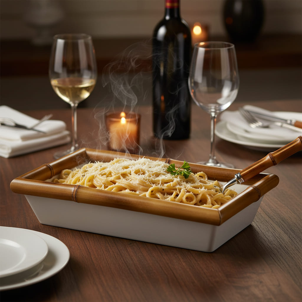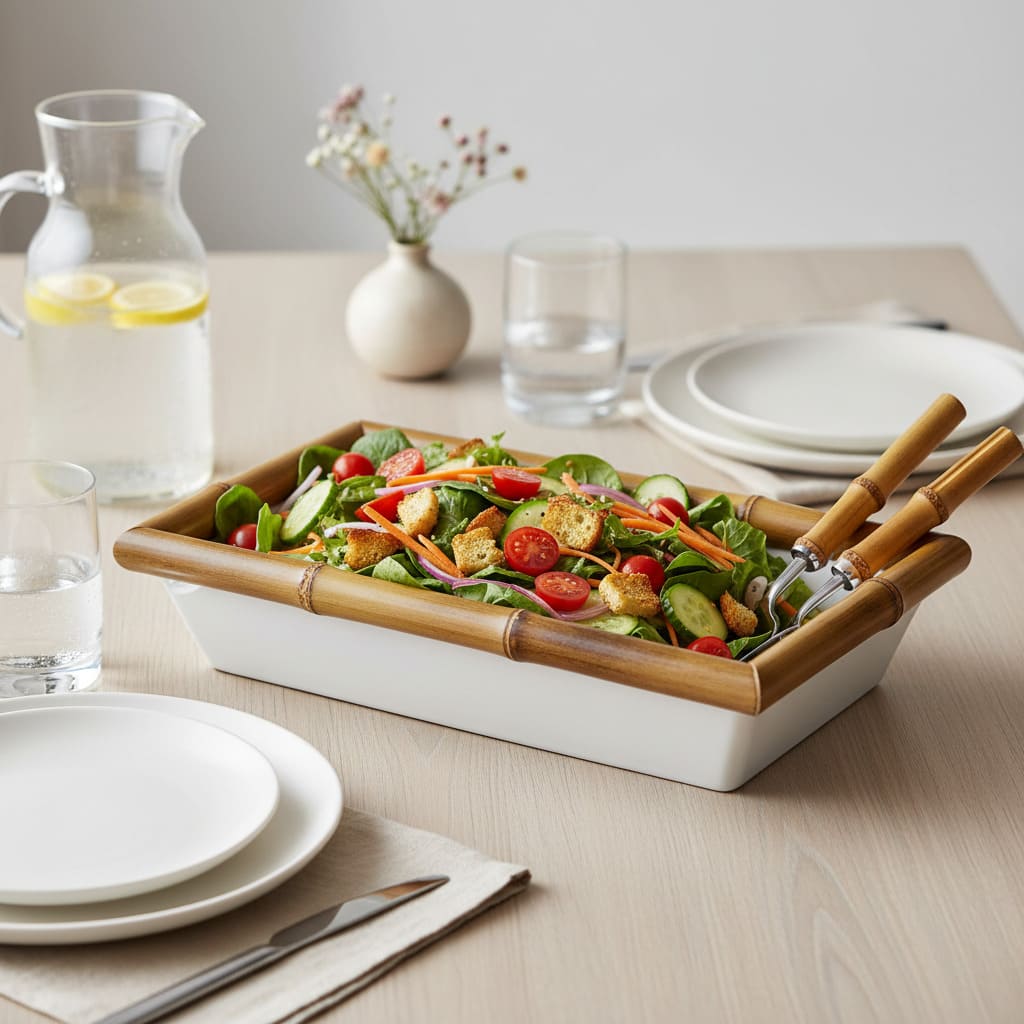 A Travessa Retangular Funda da Rico Bambu foi desenhada para quem valoriza a hospitalidade prática sem abrir mão da elegância. O corpo em melamina de alta qualidade oferece um acabamento branco impecável e brilhante, mimetizando a louça clássica, mas com a vantagem de ser extremamente leve e resistente a quedas. O grande diferencial reside na moldura em bambu natural selecionado, que “abraça” a borda da travessa, trazendo o calor e a textura que conectam sua mesa diretamente à natureza. Seu formato retangular e profundo é ideal para servir receitas com molhos, guarnições ou petiscos volumosos, garantindo uma apresentação impecável em qualquer cenário.