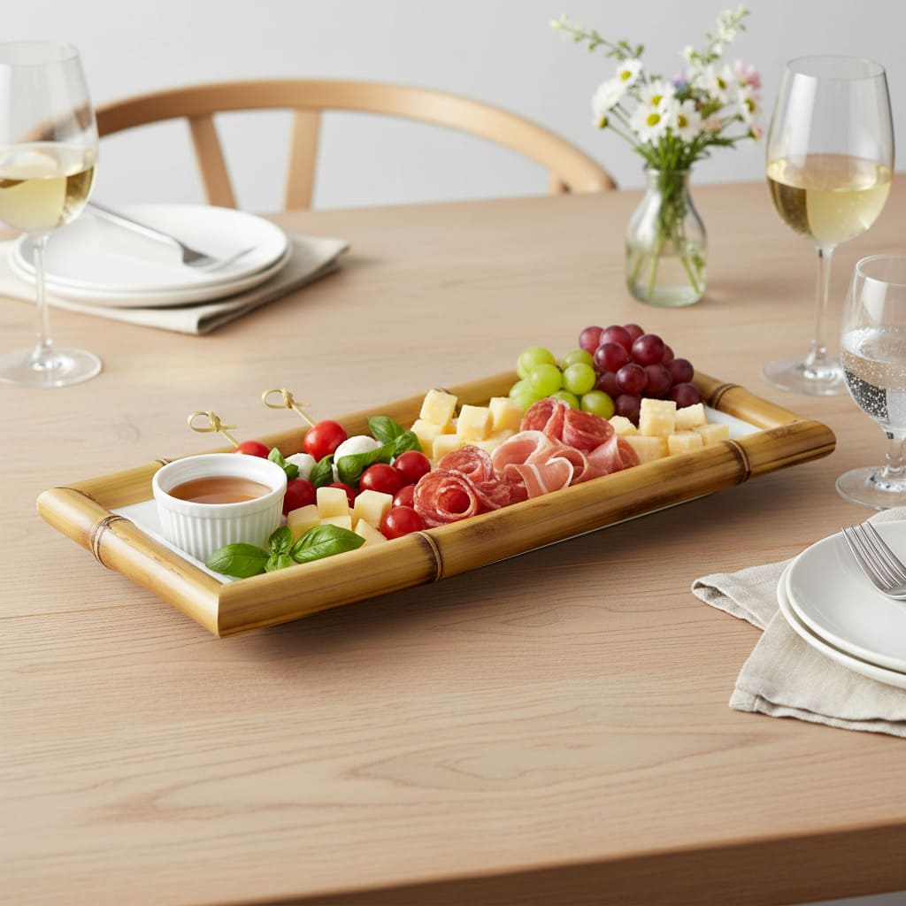 A Travessa Rasa Rico Bambu combina a praticidade da melamina branca com a beleza orgânica do bambu natural. Seu formato retangular e baixo perfil tornam a peça perfeita para apresentações delicadas e organizadas, valorizando os alimentos sem excesso de volume. É uma escolha inteligente para quem busca estética moderna com durabilidade para o uso diário ou para receber convidados.