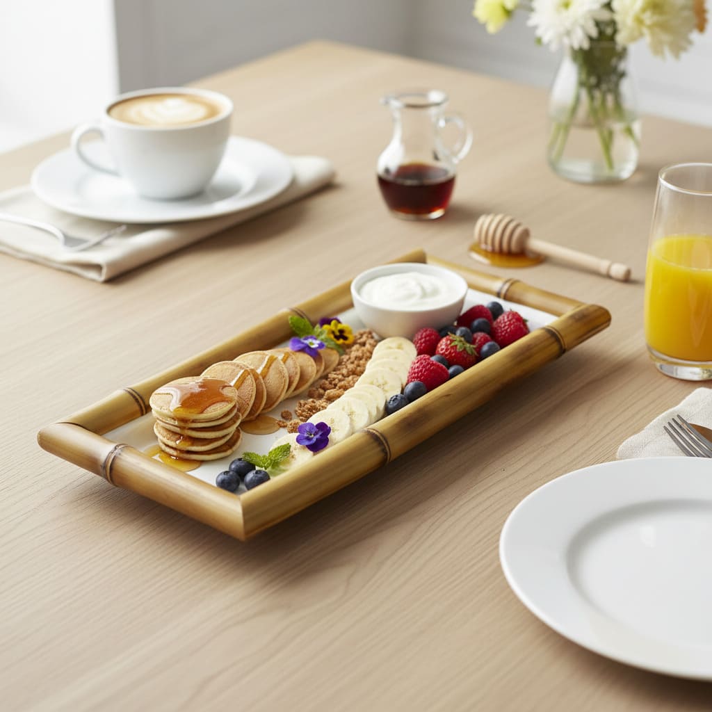 Design clean e funcionalidade para servir com elegância. A travessa rasa em melamina com bambu é ideal para petiscos, entradas e pequenas montagens, unindo resistência, leveza e um acabamento natural sofisticado.